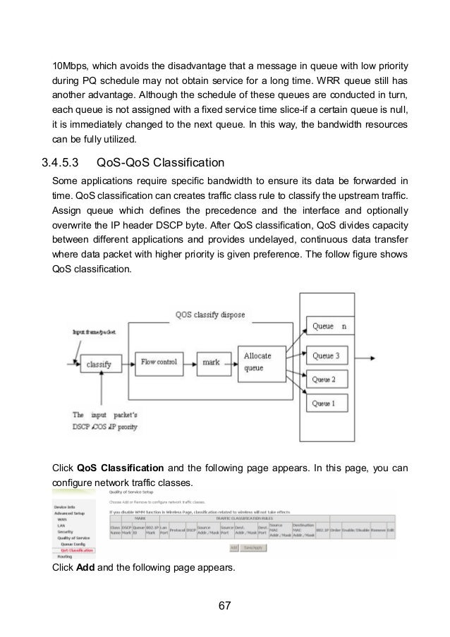 - 68. 6710Mbps, which avoids the disadvantage that a message in queue with low priorityduring PQ schedule may not obtain service for a long time. WRR queue still hasanother advantage. Although the schedule of these queues are conducted in turn,each queue is not assigned with a fixed service time slice-if a certain queue is null,it is immediately changed to the next queue. In this way, the bandwidth resourcescan be fully utilized.3.4.5.3 QoS-QoS ClassificationSome applications require specific bandwidth to ensure its data be forwarded intime. QoS classification can creates traffic class rule to classify the upstream traffic.Assign queue which defines the precedence and the interface and optionallyoverwrite the IP header DSCP byte. After QoS classification, QoS divides capacitybetween different applications and provides undelayed, continuous data transferwhere data packet with higher priority is given preference. The follow figure showsQoS classification.Click QoS Classification and the following page appears. In this page, you canconfigure network traffic classes.Click Add and the following page appears.