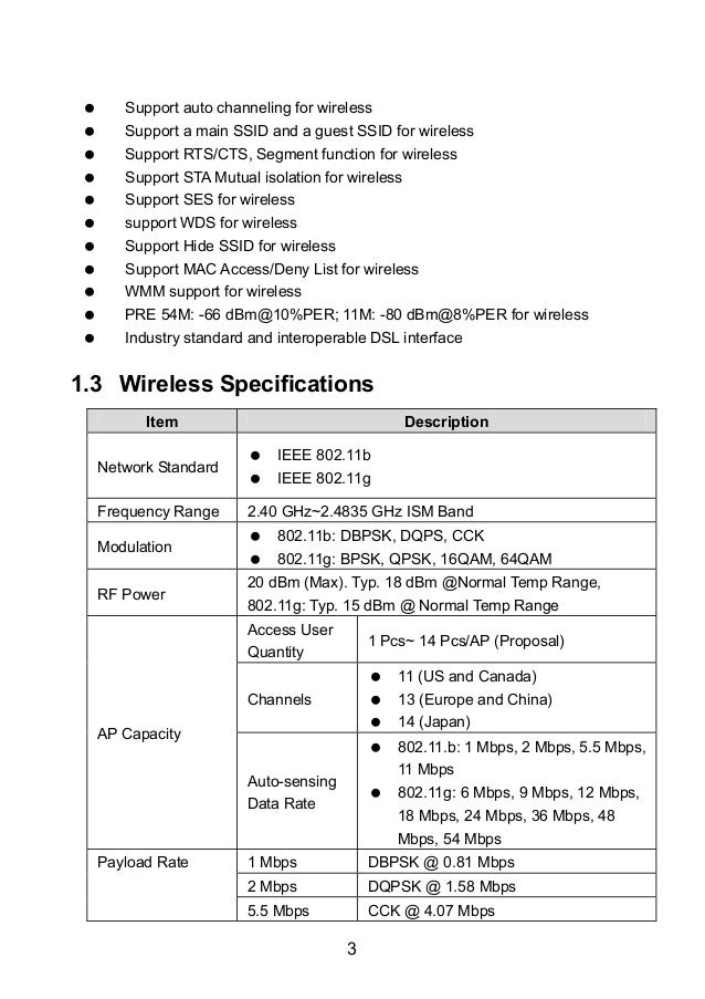 - 6. 3Support auto channeling for wirelessSupport a main SSID and a guest SSID for wirelessSupport RTS/CTS, Segment function for wirelessSupport STA Mutual isolation for wirelessSupport SES for wirelesssupport WDS for wirelessSupport Hide SSID for wirelessSupport MAC Access/Deny List for wirelessWMM support for wirelessPRE 54M: -66 dBm@10%PER; 11M: -80 dBm@8%PER for wirelessIndustry standard and interoperable DSL interface1.3 Wireless SpecificationsItem DescriptionNetwork StandardIEEE 802.11bIEEE 802.11gFrequency Range 2.40 GHz~2.4835 GHz ISM BandModulation802.11b: DBPSK, DQPS, CCK802.11g: BPSK, QPSK, 16QAM, 64QAMRF Power20 dBm (Max). Typ. 18 dBm @Normal Temp Range,802.11g: Typ. 15 dBm @ Normal Temp RangeAccess UserQuantity1 Pcs~ 14 Pcs/AP (Proposal)Channels11 (US and Canada)13 (Europe and China)14 (Japan)AP CapacityAuto-sensingData Rate802.11.b: 1 Mbps, 2 Mbps, 5.5 Mbps,11 Mbps802.11g: 6 Mbps, 9 Mbps, 12 Mbps,18 Mbps, 24 Mbps, 36 Mbps, 48Mbps, 54 Mbps1 Mbps DBPSK @ 0.81 Mbps2 Mbps DQPSK @ 1.58 MbpsPayload Rate5.5 Mbps CCK @ 4.07 Mbps
