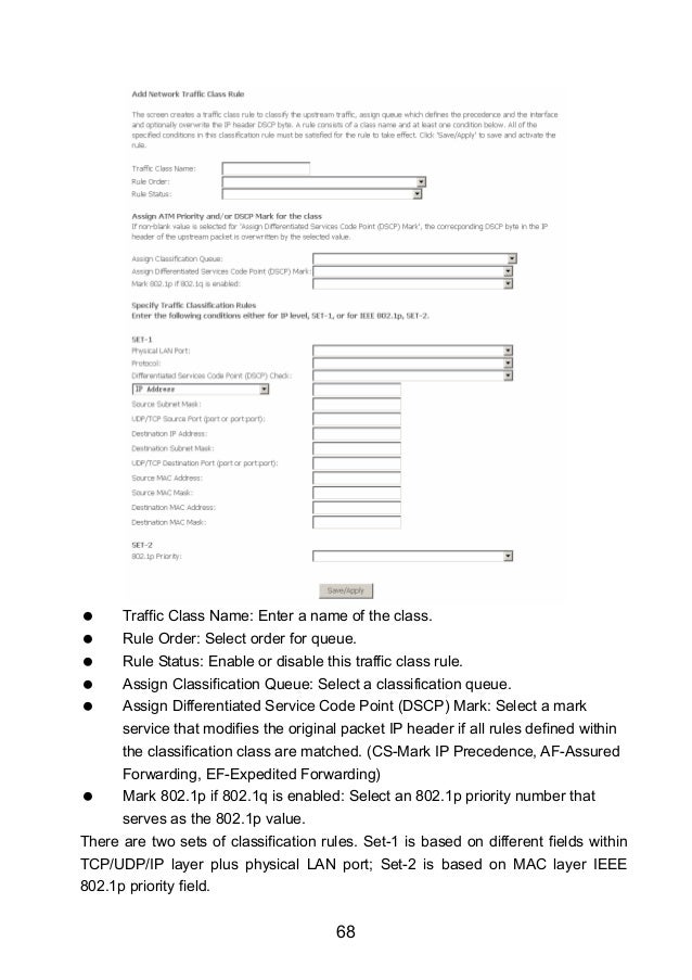 - 69. 68Traffic Class Name: Enter a name of the class.Rule Order: Select order for queue.Rule Status: Enable or disable this traffic class rule.Assign Classification Queue: Select a classification queue.Assign Differentiated Service Code Point (DSCP) Mark: Select a markservice that modifies the original packet IP header if all rules defined withinthe classification class are matched. (CS-Mark IP Precedence, AF-AssuredForwarding, EF-Expedited Forwarding)Mark 802.1p if 802.1q is enabled: Select an 802.1p priority number thatserves as the 802.1p value.There are two sets of classification rules. Set-1 is based on different fields withinTCP/UDP/IP layer plus physical LAN port; Set-2 is based on MAC layer IEEE802.1p priority field.