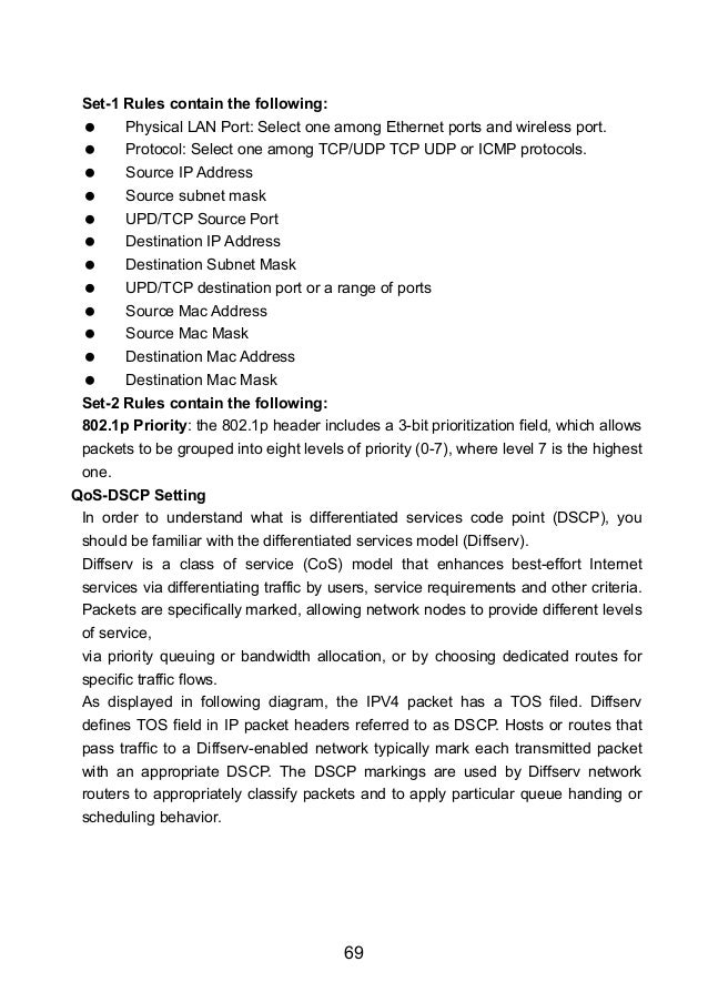 - 70. 69Set-1 Rules contain the following:Physical LAN Port: Select one among Ethernet ports and wireless port.Protocol: Select one among TCP/UDP TCP UDP or ICMP protocols.Source IP AddressSource subnet maskUPD/TCP Source PortDestination IP AddressDestination Subnet MaskUPD/TCP destination port or a range of portsSource Mac AddressSource Mac MaskDestination Mac AddressDestination Mac MaskSet-2 Rules contain the following:802.1p Priority: the 802.1p header includes a 3-bit prioritization field, which allowspackets to be grouped into eight levels of priority (0-7), where level 7 is the highestone.QoS-DSCP SettingIn order to understand what is differentiated services code point (DSCP), youshould be familiar with the differentiated services model (Diffserv).Diffserv is a class of service (CoS) model that enhances best-effort Internetservices via differentiating traffic by users, service requirements and other criteria.Packets are specifically marked, allowing network nodes to provide different levelsof service,via priority queuing or bandwidth allocation, or by choosing dedicated routes forspecific traffic flows.As displayed in following diagram, the IPV4 packet has a TOS filed. Diffservdefines TOS field in IP packet headers referred to as DSCP. Hosts or routes thatpass traffic to a Diffserv-enabled network typically mark each transmitted packetwith an appropriate DSCP. The DSCP markings are used by Diffserv networkrouters to appropriately classify packets and to apply particular queue handing orscheduling behavior.