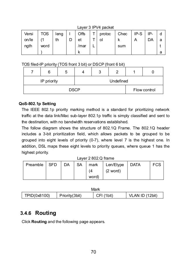 - 71. 70Layer 3 IPV4 packetVersion/lengthTOS(1word)lengthIDOffset/markTTLprotocolChecksumIP-SAIP-DAdataTOS filed-IP priority (TOS front 3 bit) or DSCP (front 6 bit)7 6 5 4 3 2 1 0IP priority UndefinedDSCP Flow controlQoS-802.1p SettingThe IEEE 802.1p priority marking method is a standard for prioritizing networktraffic at the data link/Mac sub-layer 802.1p traffic is simply classified and sent tothe destination, with no bandwidth reservations established.The follow diagram shows the structure of 802.1Q Frame. The 802.1Q headerincludes a 3-bit prioritization field, which allows packets to be grouped to begrouped into eight levels of priority (0-7), where level 7 is the highest one. Inaddition, DSL maps these eight levels to priority queues, where queue 1 has thehighest priority.Layer 2 802.Q framePreamble SFD DA SA mark(4word)Len/Etype(2 word)DATA FCSMarkTPID(0x8100) Priority(3bit) CFI (1bit) VLAN ID (12bit)3.4.6 RoutingClick Routing and the following page appears.