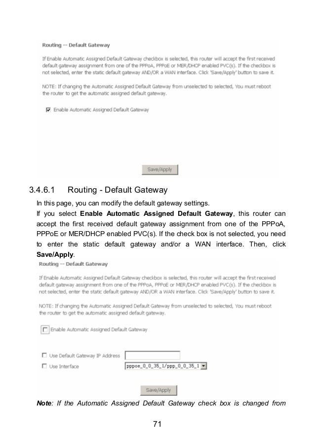 - 72. 713.4.6.1 Routing - Default GatewayIn this page, you can modify the default gateway settings.If you select Enable Automatic Assigned Default Gateway, this router canaccept the first received default gateway assignment from one of the PPPoA,PPPoE or MER/DHCP enabled PVC(s). If the check box is not selected, you needto enter the static default gateway and/or a WAN interface. Then, clickSave/Apply.Note: If the Automatic Assigned Default Gateway check box is changed from