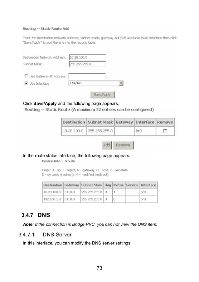 - 74. 73Click Save/Apply and the following page appears.In the route status interface, the following page appears.3.4.7 DNSNote: If the connection is Bridge PVC, you can not view the DNS item.3.4.7.1 DNS ServerIn this interface, you can modify the DNS server settings.