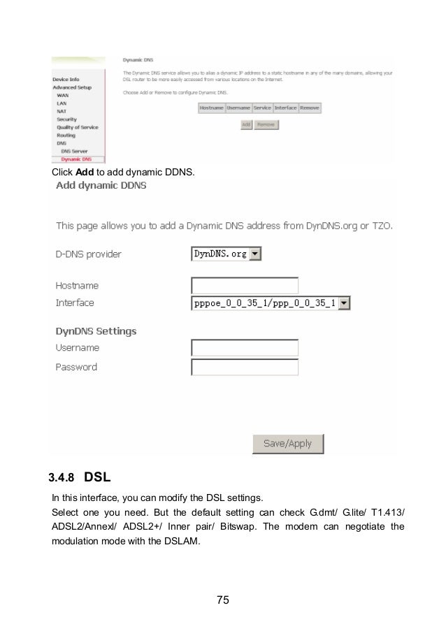 - 76. 75Click Add to add dynamic DDNS.3.4.8 DSLIn this interface, you can modify the DSL settings.Select one you need. But the default setting can check G.dmt/ G.lite/ T1.413/ADSL2/Annexl/ ADSL2+/ Inner pair/ Bitswap. The modem can negotiate themodulation mode with the DSLAM.