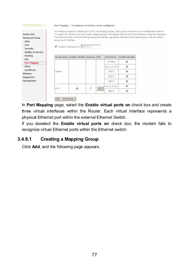 - 77. 763.4.9 Port MappingPort Mapping supports multiple ports to PVC and bridging groups. Each groupperforms as an independent network. To support this feature, you must createmapping groups with appropriate LAN and WAN interfaces using the Add button.The Save/Apply button removes the grouping and adds the ungrouped interfacesto the Default group, or Enable/Disable the grouping. Only the default group hasthe IP interface and it can’t be removed.