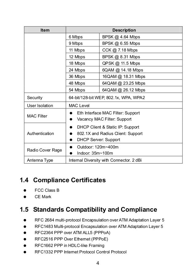 - 7. 4Item Description6 Mbps BPSK @ 4.64 Mbps9 Mbps BPSK @ 6.55 Mbps11 Mbps CCK @ 7.18 Mbps12 Mbps BPSK @ 8.31 Mbps18 Mbps QPSK @ 11.5 Mbps24 Mbps 6QAM @ 14.18 Mbps36 Mbps 16QAM @ 18.31 Mbps48 Mbps 64QAM @ 23.25 Mbps54 Mbps 64QAM @ 26.12 MbpsSecurity 64-bit/128-bit WEP, 802.1x, WPA, WPA2User Isolation MAC LevelMAC FilterEth Interface MAC Filter: SupportVacancy MAC Filter: SupportAuthenticationDHCP Client & Static IP: Support802.1X and Radius Client: SupportDHCP Server: SupportRadio Cover RageOutdoor: 120m~400mIndoor: 35m~100mAntenna Type Internal Diversity with Connector. 2 dBi1.4 Compliance CertificatesFCC Class BCE Mark1.5 Standards Compatibility and ComplianceRFC 2684 multi-protocol Encapsulation over ATM Adaptation Layer 5RFC1483 Multi-protocol Encapsulation over ATM Adaptation Layer 5RFC2364 PPP over ATM ALL5 (PPPoA)RFC2516 PPP Over Ethernet (PPPoE)RFC1662 PPP in HDLC-like FramingRFC1332 PPP Internet Protocol Control Protocol