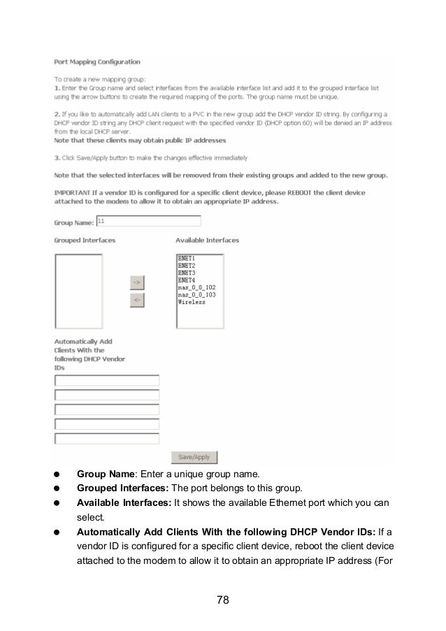 - 79. 78Group Name: Enter a unique group name.Grouped Interfaces: The port belongs to this group.Available Interfaces: It shows the available Ethernet port which you canselect.Automatically Add Clients With the following DHCP Vendor IDs: If avendor ID is configured for a specific client device, reboot the client deviceattached to the modem to allow it to obtain an appropriate IP address (For