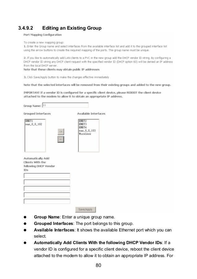 - 81. 803.4.9.2 Editing an Existing GroupGroup Name: Enter a unique group name.Grouped Interfaces: The port belongs to this group.Available Interfaces: It shows the available Ethernet port which you canselect.Automatically Add Clients With the following DHCP Vendor IDs: If avendor ID is configured for a specific client device, reboot the client deviceattached to the modem to allow it to obtain an appropriate IP address. For