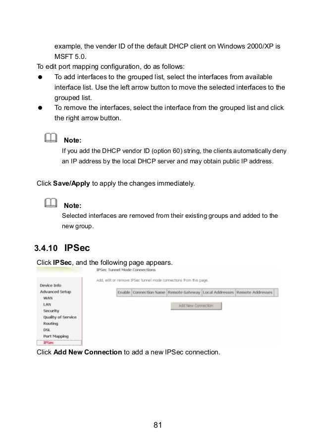 - 82. 81example, the vender ID of the default DHCP client on Windows 2000/XP isMSFT 5.0.To edit port mapping configuration, do as follows:To add interfaces to the grouped list, select the interfaces from availableinterface list. Use the left arrow button to move the selected interfaces to thegrouped list.To remove the interfaces, select the interface from the grouped list and clickthe right arrow button.Note:If you add the DHCP vendor ID (option 60) string, the clients automatically denyan IP address by the local DHCP server and may obtain public IP address.Click Save/Apply to apply the changes immediately.Note:Selected interfaces are removed from their existing groups and added to thenew group.3.4.10 IPSecClick IPSec, and the following page appears.Click Add New Connection to add a new IPSec connection.