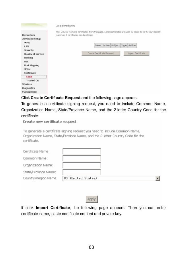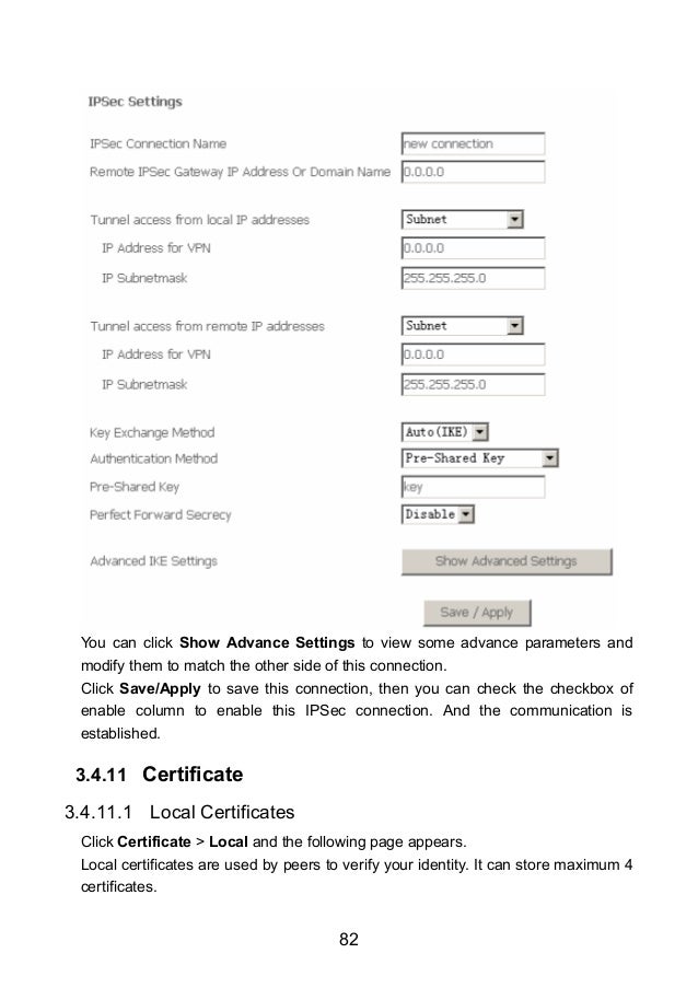 - 83. 82You can click Show Advance Settings to view some advance parameters andmodify them to match the other side of this connection.Click Save/Apply to save this connection, then you can check the checkbox ofenable column to enable this IPSec connection. And the communication isestablished.3.4.11 Certificate3.4.11.1 Local CertificatesClick Certificate > Local and the following page appears.Local certificates are used by peers to verify your identity. It can store maximum 4certificates.