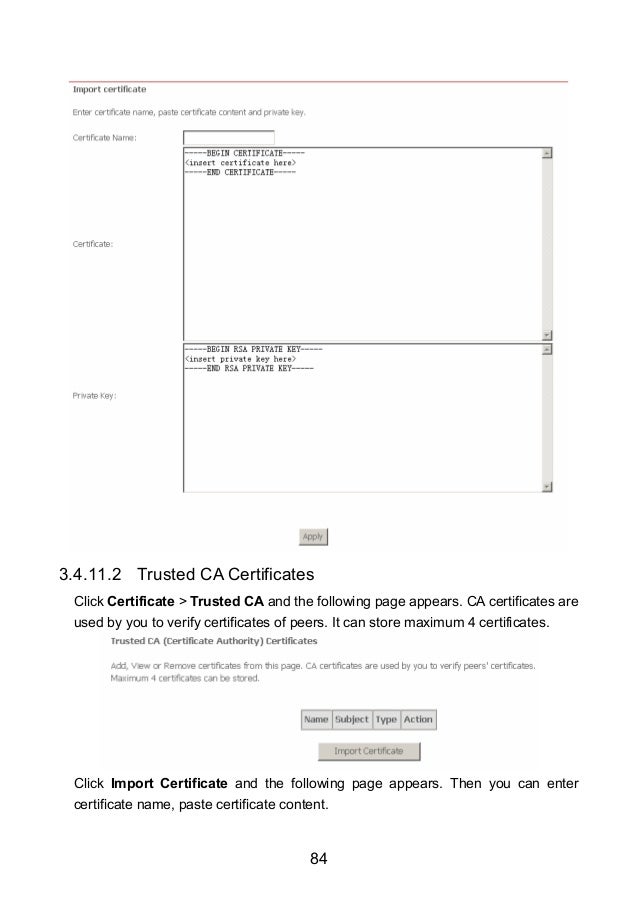 - 85. 843.4.11.2 Trusted CA CertificatesClick Certificate > Trusted CA and the following page appears. CA certificates areused by you to verify certificates of peers. It can store maximum 4 certificates.Click Import Certificate and the following page appears. Then you can entercertificate name, paste certificate content.