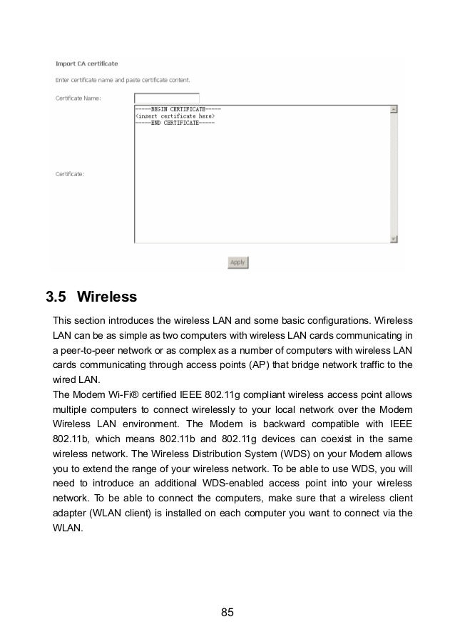 - 86. 853.5 WirelessThis section introduces the wireless LAN and some basic configurations. WirelessLAN can be as simple as two computers with wireless LAN cards communicating ina peer-to-peer network or as complex as a number of computers with wireless LANcards communicating through access points (AP) that bridge network traffic to thewired LAN.The Modem Wi-Fi® certified IEEE 802.11g compliant wireless access point allowsmultiple computers to connect wirelessly to your local network over the ModemWireless LAN environment. The Modem is backward compatible with IEEE802.11b, which means 802.11b and 802.11g devices can coexist in the samewireless network. The Wireless Distribution System (WDS) on your Modem allowsyou to extend the range of your wireless network. To be able to use WDS, you willneed to introduce an additional WDS-enabled access point into your wirelessnetwork. To be able to connect the computers, make sure that a wireless clientadapter (WLAN client) is installed on each computer you want to connect via theWLAN.
