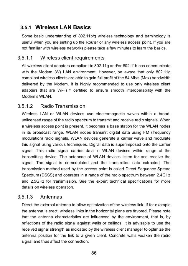- 87. 863.5.1 Wireless LAN BasicsSome basic understanding of 802.11b/g wireless technology and terminology isuseful when you are setting up the Router or any wireless access point. If you arenot familiar with wireless networks please take a few minutes to learn the basics.3.5.1.1 Wireless client requirementsAll wireless client adapters compliant to 802.11g and/or 802.11b can communicatewith the Modem (W) LAN environment. However, be aware that only 802.11gcompliant wireless clients are able to gain full profit of the 54 Mb/s (Max) bandwidthdelivered by the Modem. It is highly recommended to use only wireless clientadapters that are Wi-Fi™ certified to ensure smooth interoperability with theModem’s WLAN.3.5.1.2 Radio TransmissionWireless LAN or WLAN devices use electromagnetic waves within a broad,unlicensed range of the radio spectrum to transmit and receive radio signals. Whena wireless access point is present, it becomes a base station for the WLAN nodesin its broadcast range. WLAN nodes transmit digital data using FM (frequencymodulation) radio signals. WLAN devices generate a carrier wave and modulatethis signal using various techniques. Digital data is superimposed onto the carriersignal. This radio signal carries data to WLAN devices within range of thetransmitting device. The antennae of WLAN devices listen for and receive thesignal. The signal is demodulated and the transmitted data extracted. Thetransmission method used by the access point is called Direct Sequence SpreadSpectrum (DSSS) and operates in a range of the radio spectrum between 2.4GHzand 2.5GHz for transmission. See the expert technical specifications for moredetails on wireless operation.3.5.1.3 AntennasDirect the external antenna to allow optimization of the wireless link. If for examplethe antenna is erect, wireless links in the horizontal plane are favored. Please notethat the antenna characteristics are influenced by the environment, that is, byreflections of the radio signal against walls or ceilings. It is advisable to use thereceived signal strength as indicated by the wireless client manager to optimize theantenna position for the link to a given client. Concrete walls weaken the radiosignal and thus affect the connection.