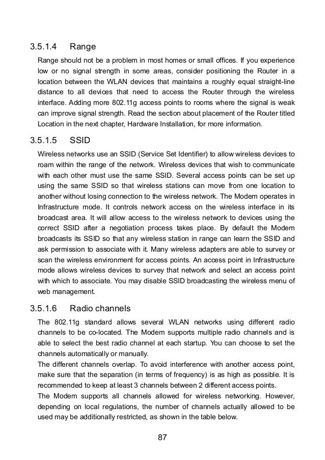 - 88. 873.5.1.4 RangeRange should not be a problem in most homes or small offices. If you experiencelow or no signal strength in some areas, consider positioning the Router in alocation between the WLAN devices that maintains a roughly equal straight-linedistance to all devices that need to access the Router through the wirelessinterface. Adding more 802.11g access points to rooms where the signal is weakcan improve signal strength. Read the section about placement of the Router titledLocation in the next chapter, Hardware Installation, for more information.3.5.1.5 SSIDWireless networks use an SSID (Service Set Identifier) to allow wireless devices toroam within the range of the network. Wireless devices that wish to communicatewith each other must use the same SSID. Several access points can be set upusing the same SSID so that wireless stations can move from one location toanother without losing connection to the wireless network. The Modem operates inInfrastructure mode. It controls network access on the wireless interface in itsbroadcast area. It will allow access to the wireless network to devices using thecorrect SSID after a negotiation process takes place. By default the Modembroadcasts its SSID so that any wireless station in range can learn the SSID andask permission to associate with it. Many wireless adapters are able to survey orscan the wireless environment for access points. An access point in Infrastructuremode allows wireless devices to survey that network and select an access pointwith which to associate. You may disable SSID broadcasting the wireless menu ofweb management.3.5.1.6 Radio channelsThe 802.11g standard allows several WLAN networks using different radiochannels to be co-located. The Modem supports multiple radio channels and isable to select the best radio channel at each startup. You can choose to set thechannels automatically or manually.The different channels overlap. To avoid interference with another access point,make sure that the separation (in terms of frequency) is as high as possible. It isrecommended to keep at least 3 channels between 2 different access points.The Modem supports all channels allowed for wireless networking. However,depending on local regulations, the number of channels actually allowed to beused may be additionally restricted, as shown in the table below.