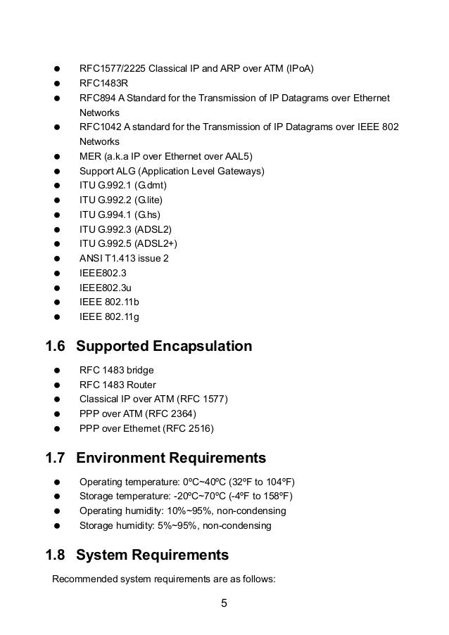 - 8. 5RFC1577/2225 Classical IP and ARP over ATM (IPoA)RFC1483RRFC894 A Standard for the Transmission of IP Datagrams over EthernetNetworksRFC1042 A standard for the Transmission of IP Datagrams over IEEE 802NetworksMER (a.k.a IP over Ethernet over AAL5)Support ALG (Application Level Gateways)ITU G.992.1 (G.dmt)ITU G.992.2 (G.lite)ITU G.994.1 (G.hs)ITU G.992.3 (ADSL2)ITU G.992.5 (ADSL2+)ANSI T1.413 issue 2IEEE802.3IEEE802.3uIEEE 802.11bIEEE 802.11g1.6 Supported EncapsulationRFC 1483 bridgeRFC 1483 RouterClassical IP over ATM (RFC 1577)PPP over ATM (RFC 2364)PPP over Ethernet (RFC 2516)1.7 Environment RequirementsOperating temperature: 0ºC~40ºC (32ºF to 104ºF)Storage temperature: -20ºC~70ºC (-4ºF to 158ºF)Operating humidity: 10%~95%, non-condensingStorage humidity: 5%~95%, non-condensing1.8 System RequirementsRecommended system requirements are as follows: