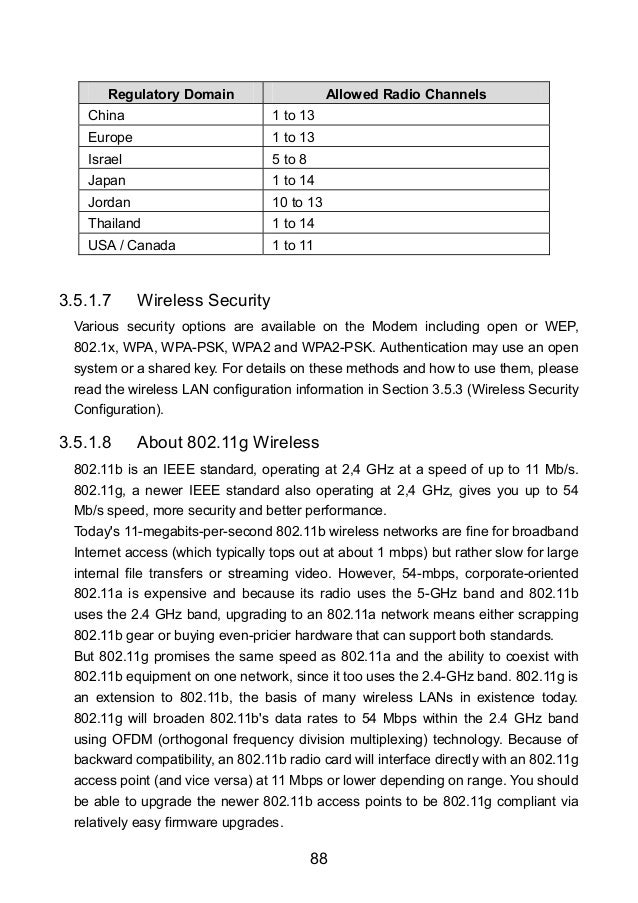 - 89. 88Regulatory Domain Allowed Radio ChannelsChina 1 to 13Europe 1 to 13Israel 5 to 8Japan 1 to 14Jordan 10 to 13Thailand 1 to 14USA / Canada 1 to 113.5.1.7 Wireless SecurityVarious security options are available on the Modem including open or WEP,802.1x, WPA, WPA-PSK, WPA2 and WPA2-PSK. Authentication may use an opensystem or a shared key. For details on these methods and how to use them, pleaseread the wireless LAN configuration information in Section 3.5.3 (Wireless SecurityConfiguration).3.5.1.8 About 802.11g Wireless802.11b is an IEEE standard, operating at 2,4 GHz at a speed of up to 11 Mb/s.802.11g, a newer IEEE standard also operating at 2,4 GHz, gives you up to 54Mb/s speed, more security and better performance.Todays 11-megabits-per-second 802.11b wireless networks are fine for broadbandInternet access (which typically tops out at about 1 mbps) but rather slow for largeinternal file transfers or streaming video. However, 54-mbps, corporate-oriented802.11a is expensive and because its radio uses the 5-GHz band and 802.11buses the 2.4 GHz band, upgrading to an 802.11a network means either scrapping802.11b gear or buying even-pricier hardware that can support both standards.But 802.11g promises the same speed as 802.11a and the ability to coexist with802.11b equipment on one network, since it too uses the 2.4-GHz band. 802.11g isan extension to 802.11b, the basis of many wireless LANs in existence today.802.11g will broaden 802.11bs data rates to 54 Mbps within the 2.4 GHz bandusing OFDM (orthogonal frequency division multiplexing) technology. Because ofbackward compatibility, an 802.11b radio card will interface directly with an 802.11gaccess point (and vice versa) at 11 Mbps or lower depending on range. You shouldbe able to upgrade the newer 802.11b access points to be 802.11g compliant viarelatively easy firmware upgrades.