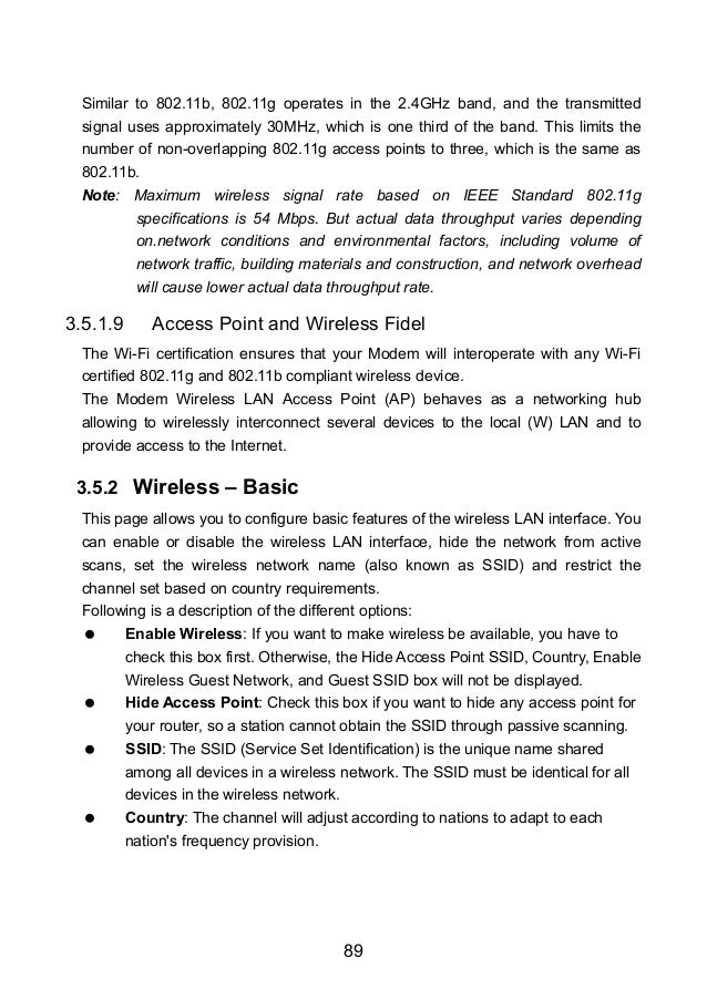 - 90. 89Similar to 802.11b, 802.11g operates in the 2.4GHz band, and the transmittedsignal uses approximately 30MHz, which is one third of the band. This limits thenumber of non-overlapping 802.11g access points to three, which is the same as802.11b.Note: Maximum wireless signal rate based on IEEE Standard 802.11gspecifications is 54 Mbps. But actual data throughput varies dependingon.network conditions and environmental factors, including volume ofnetwork traffic, building materials and construction, and network overheadwill cause lower actual data throughput rate.3.5.1.9 Access Point and Wireless FidelThe Wi-Fi certification ensures that your Modem will interoperate with any Wi-Ficertified 802.11g and 802.11b compliant wireless device.The Modem Wireless LAN Access Point (AP) behaves as a networking huballowing to wirelessly interconnect several devices to the local (W) LAN and toprovide access to the Internet.3.5.2 Wireless – BasicThis page allows you to configure basic features of the wireless LAN interface. Youcan enable or disable the wireless LAN interface, hide the network from activescans, set the wireless network name (also known as SSID) and restrict thechannel set based on country requirements.Following is a description of the different options:Enable Wireless: If you want to make wireless be available, you have tocheck this box first. Otherwise, the Hide Access Point SSID, Country, EnableWireless Guest Network, and Guest SSID box will not be displayed.Hide Access Point: Check this box if you want to hide any access point foryour router, so a station cannot obtain the SSID through passive scanning.SSID: The SSID (Service Set Identification) is the unique name sharedamong all devices in a wireless network. The SSID must be identical for alldevices in the wireless network.Country: The channel will adjust according to nations to adapt to eachnations frequency provision.