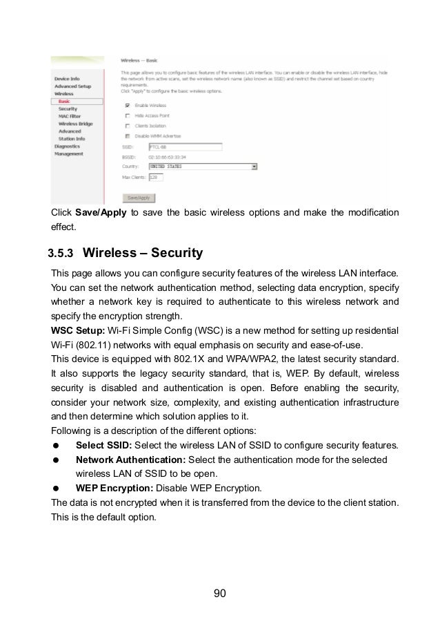 - 91. 90Click Save/Apply to save the basic wireless options and make the modificationeffect.3.5.3 Wireless – SecurityThis page allows you can configure security features of the wireless LAN interface.You can set the network authentication method, selecting data encryption, specifywhether a network key is required to authenticate to this wireless network andspecify the encryption strength.WSC Setup: Wi-Fi Simple Config (WSC) is a new method for setting up residentialWi-Fi (802.11) networks with equal emphasis on security and ease-of-use.This device is equipped with 802.1X and WPA/WPA2, the latest security standard.It also supports the legacy security standard, that is, WEP. By default, wirelesssecurity is disabled and authentication is open. Before enabling the security,consider your network size, complexity, and existing authentication infrastructureand then determine which solution applies to it.Following is a description of the different options:Select SSID: Select the wireless LAN of SSID to configure security features.Network Authentication: Select the authentication mode for the selectedwireless LAN of SSID to be open.WEP Encryption: Disable WEP Encryption.The data is not encrypted when it is transferred from the device to the client station.This is the default option.