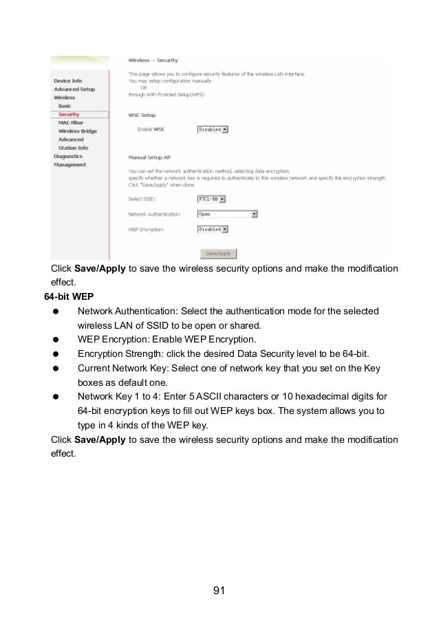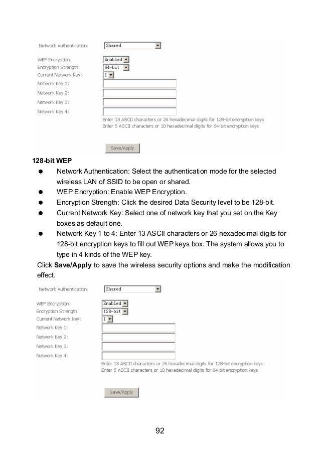- 92. 91Click Save/Apply to save the wireless security options and make the modificationeffect.64-bit WEPNetwork Authentication: Select the authentication mode for the selectedwireless LAN of SSID to be open or shared.WEP Encryption: Enable WEP Encryption.Encryption Strength: click the desired Data Security level to be 64-bit.Current Network Key: Select one of network key that you set on the Keyboxes as default one.Network Key 1 to 4: Enter 5 ASCII characters or 10 hexadecimal digits for64-bit encryption keys to fill out WEP keys box. The system allows you totype in 4 kinds of the WEP key.Click Save/Apply to save the wireless security options and make the modificationeffect.
