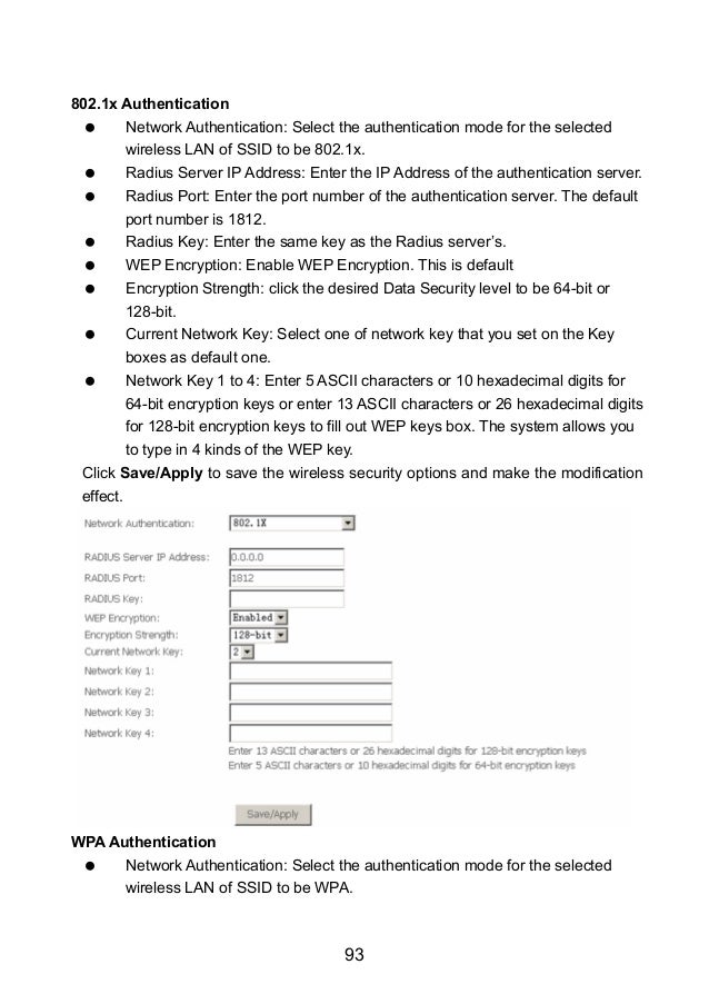 - 94. 93802.1x AuthenticationNetwork Authentication: Select the authentication mode for the selectedwireless LAN of SSID to be 802.1x.Radius Server IP Address: Enter the IP Address of the authentication server.Radius Port: Enter the port number of the authentication server. The defaultport number is 1812.Radius Key: Enter the same key as the Radius server’s.WEP Encryption: Enable WEP Encryption. This is defaultEncryption Strength: click the desired Data Security level to be 64-bit or128-bit.Current Network Key: Select one of network key that you set on the Keyboxes as default one.Network Key 1 to 4: Enter 5 ASCII characters or 10 hexadecimal digits for64-bit encryption keys or enter 13 ASCII characters or 26 hexadecimal digitsfor 128-bit encryption keys to fill out WEP keys box. The system allows youto type in 4 kinds of the WEP key.Click Save/Apply to save the wireless security options and make the modificationeffect.WPA AuthenticationNetwork Authentication: Select the authentication mode for the selectedwireless LAN of SSID to be WPA.