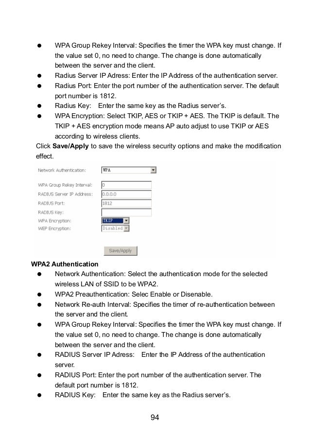 - 95. 94WPA Group Rekey Interval: Specifies the timer the WPA key must change. Ifthe value set 0, no need to change. The change is done automaticallybetween the server and the client.Radius Server IP Adress: Enter the IP Address of the authentication server.Radius Port: Enter the port number of the authentication server. The defaultport number is 1812.Radius Key: Enter the same key as the Radius server’s.WPA Encryption: Select TKIP, AES or TKIP + AES. The TKIP is default. TheTKIP + AES encryption mode means AP auto adjust to use TKIP or AESaccording to wireless clients.Click Save/Apply to save the wireless security options and make the modificationeffect.WPA2 AuthenticationNetwork Authentication: Select the authentication mode for the selectedwireless LAN of SSID to be WPA2.WPA2 Preauthentication: Selec Enable or Disenable.Network Re-auth Interval: Specifies the timer of re-authentication betweenthe server and the client.WPA Group Rekey Interval: Specifies the timer the WPA key must change. Ifthe value set 0, no need to change. The change is done automaticallybetween the server and the client.RADIUS Server IP Adress: Enter the IP Address of the authenticationserver.RADIUS Port: Enter the port number of the authentication server. Thedefault port number is 1812.RADIUS Key: Enter the same key as the Radius server’s.