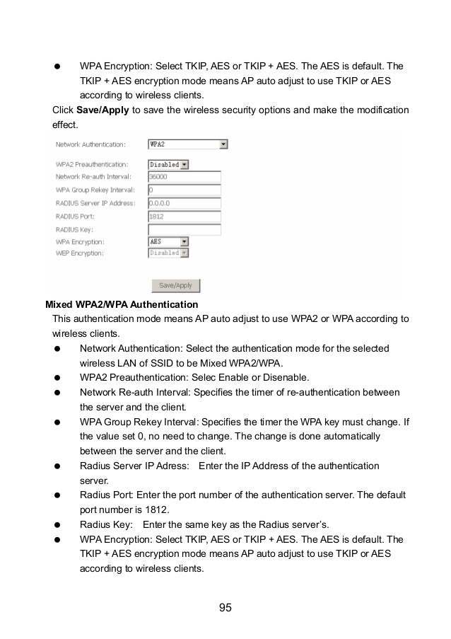 - 96. 95WPA Encryption: Select TKIP, AES or TKIP + AES. The AES is default. TheTKIP + AES encryption mode means AP auto adjust to use TKIP or AESaccording to wireless clients.Click Save/Apply to save the wireless security options and make the modificationeffect.Mixed WPA2/WPA AuthenticationThis authentication mode means AP auto adjust to use WPA2 or WPA according towireless clients.Network Authentication: Select the authentication mode for the selectedwireless LAN of SSID to be Mixed WPA2/WPA.WPA2 Preauthentication: Selec Enable or Disenable.Network Re-auth Interval: Specifies the timer of re-authentication betweenthe server and the client.WPA Group Rekey Interval: Specifies the timer the WPA key must change. Ifthe value set 0, no need to change. The change is done automaticallybetween the server and the client.Radius Server IP Adress: Enter the IP Address of the authenticationserver.Radius Port: Enter the port number of the authentication server. The defaultport number is 1812.Radius Key: Enter the same key as the Radius server’s.WPA Encryption: Select TKIP, AES or TKIP + AES. The AES is default. TheTKIP + AES encryption mode means AP auto adjust to use TKIP or AESaccording to wireless clients.