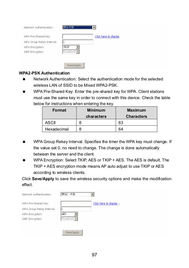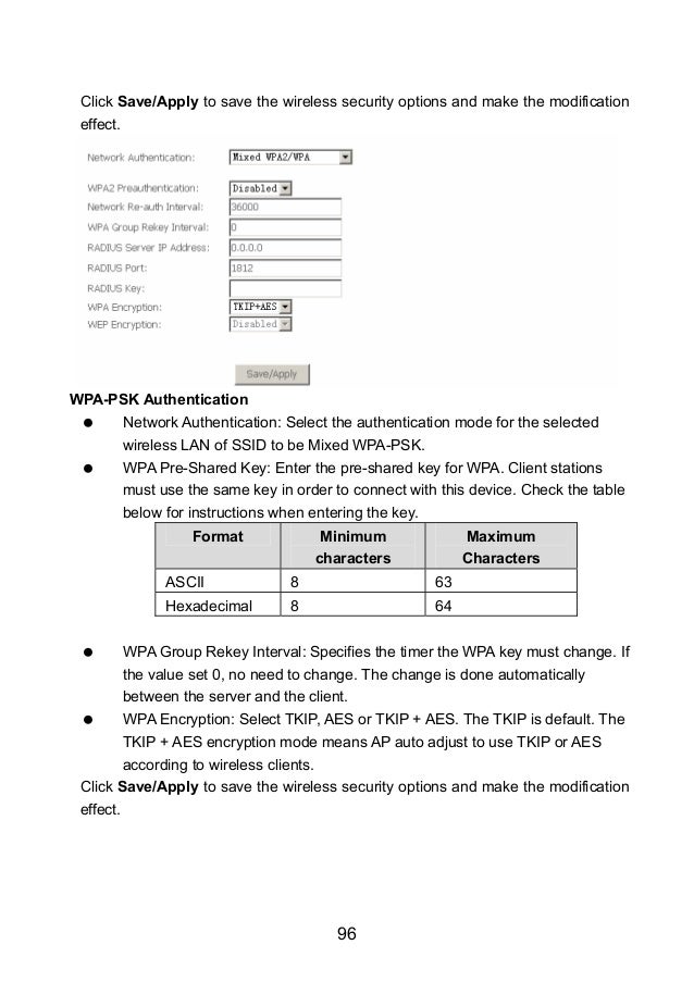 - 97. 96Click Save/Apply to save the wireless security options and make the modificationeffect.WPA-PSK AuthenticationNetwork Authentication: Select the authentication mode for the selectedwireless LAN of SSID to be Mixed WPA-PSK.WPA Pre-Shared Key: Enter the pre-shared key for WPA. Client stationsmust use the same key in order to connect with this device. Check the tablebelow for instructions when entering the key.Format MinimumcharactersMaximumCharactersASCII 8 63Hexadecimal 8 64WPA Group Rekey Interval: Specifies the timer the WPA key must change. Ifthe value set 0, no need to change. The change is done automaticallybetween the server and the client.WPA Encryption: Select TKIP, AES or TKIP + AES. The TKIP is default. TheTKIP + AES encryption mode means AP auto adjust to use TKIP or AESaccording to wireless clients.Click Save/Apply to save the wireless security options and make the modificationeffect.